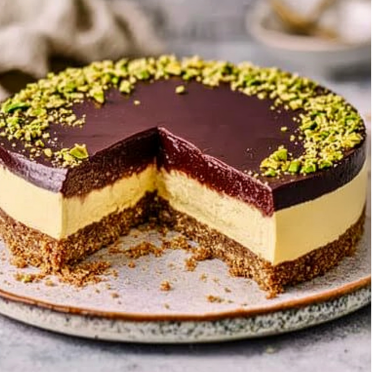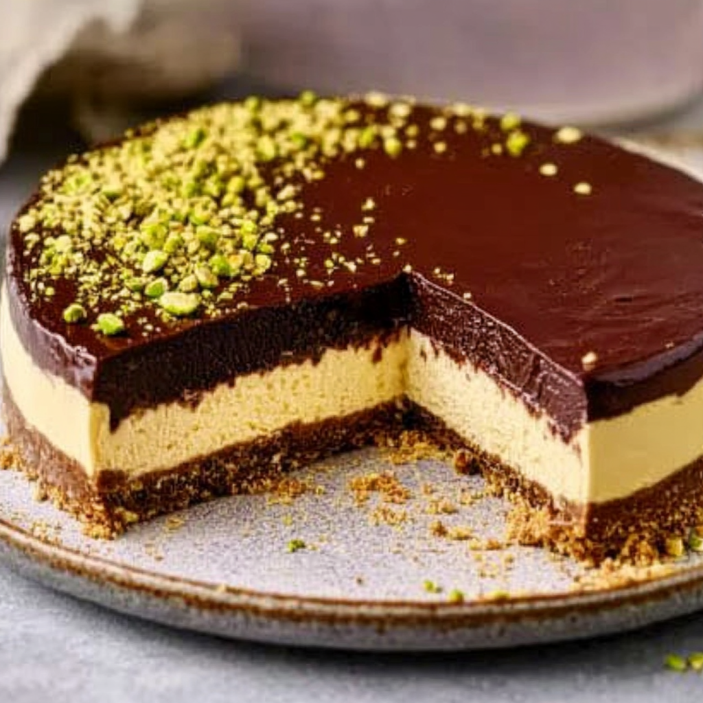 This Dubai Chocolate Cheesecake features a chocolate cookie crust, crunchy pistachio kataifi filling, creamy pistachio cheesecake, and a glossy ganache topping—an indulgent, flavor-packed dessert with irresistible texture.