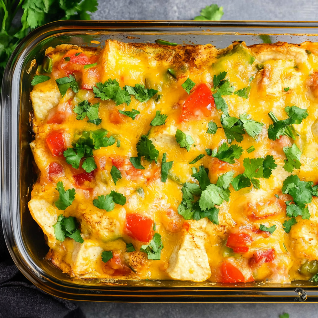 Once baked, garnish your casserole with fresh cilantro and diced tomatoes. Serve immediately with fresh jalapeño slices if desired for an extra kick!