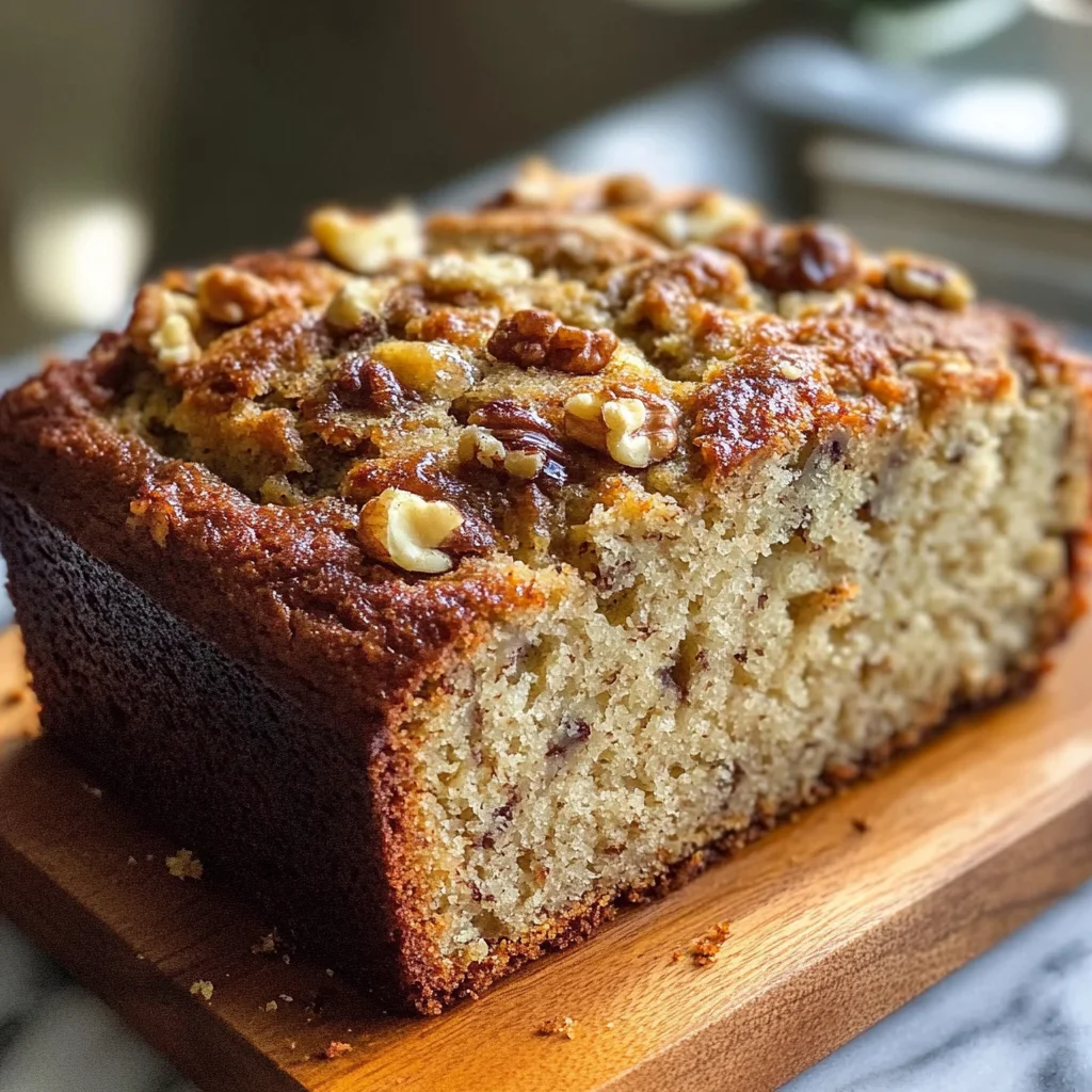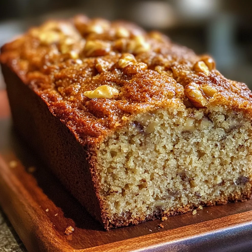 Golden banana bread with ripe bananas, buttery flavor, and a hint of spice—delicious warm or cool.